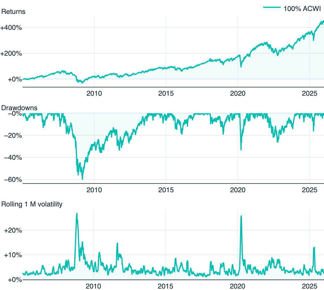 - 100% ACWI: maximum simplicity but highest volatility and deepest drawdowns